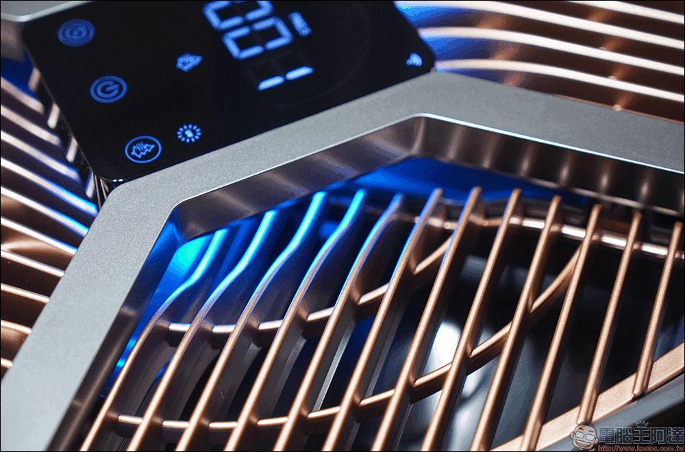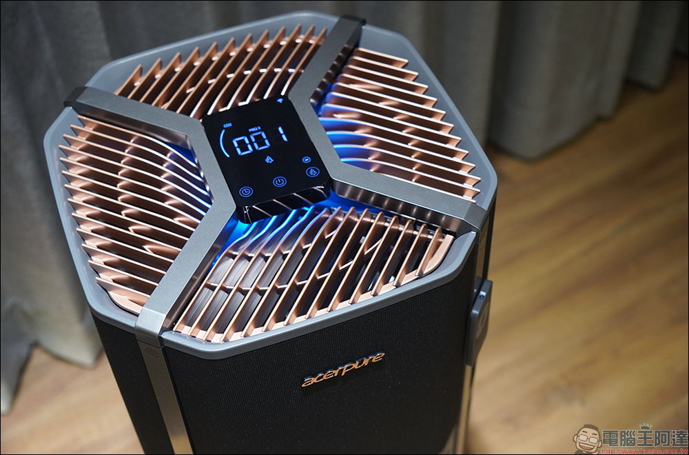 在 Acerpure 黑武士高效空氣清淨機機身頂部,採用金屬色澤的灰色搭配大面積的古銅金色格柵出風口,中央則配置直覺式觸控面板。