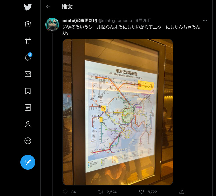 過去還沒有螢幕的時代,路線圖、廣告看板都是用印刷,因此如果要更改內容,為了省錢省時間,有些公司作法就會直接用小貼紙更正,特別是車站路線圖這種不用說一定要很美觀。而隨著有螢幕之後,更改也變簡單,換圖就好。不過不知道是車站人員年紀偏大,還是其他原因,最近在東京車站就出現一個奇妙的畫面,一塊顯示著東京近郊路線圖的螢幕,因路線有變動,車站人員是直接將新的路線貼紙貼在螢幕上,而不是換裡面的圖片。