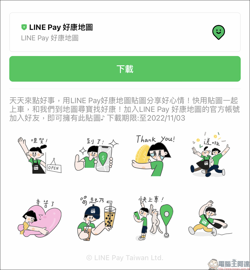 為慶祝「LINE Pay 好康地圖」官方帳號上線,即日起至 11 月 3 日加入 LINE 好友,即可將「LINE Pay好康地圖,來點日常小確幸」這組免費貼圖下載來使用囉!