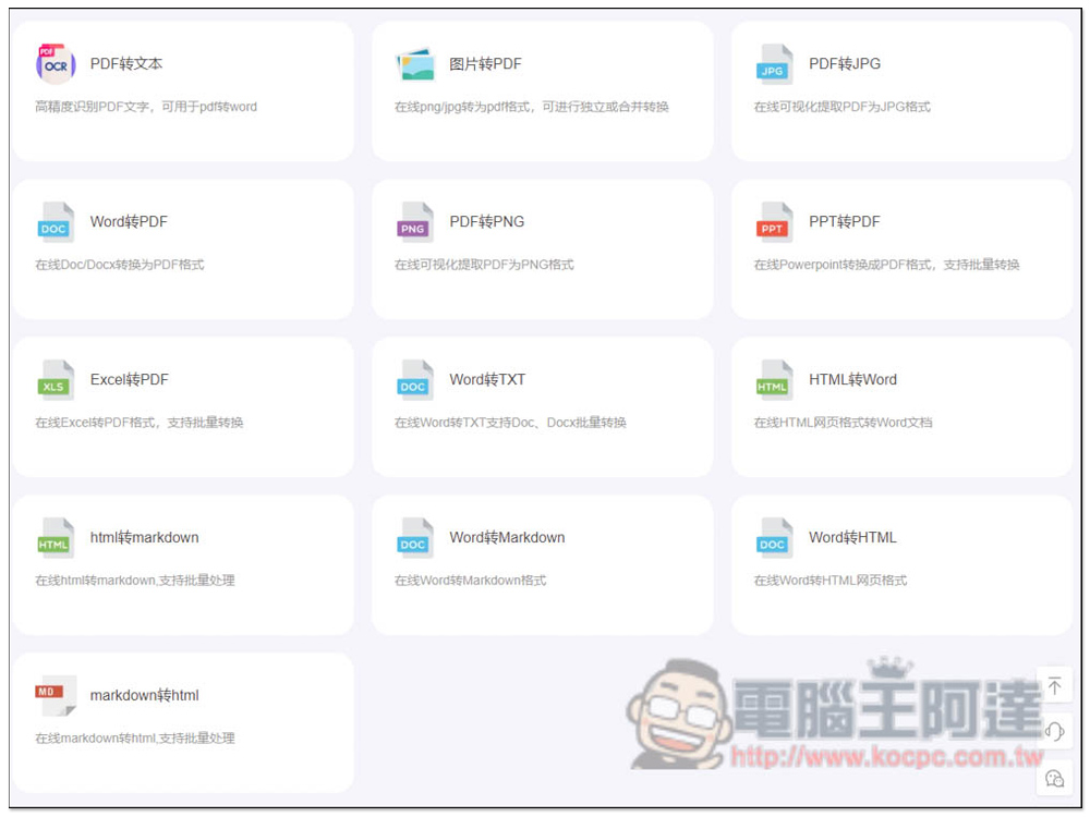 文檔轉換有 PDF 合併、PDF 提取、PDF 拆分、PDF 壓縮、PDF 排序、PDF 刪除、PDF 解鎖、PDF 添加浮水印、PDF 旋轉、PDF 加密等等: