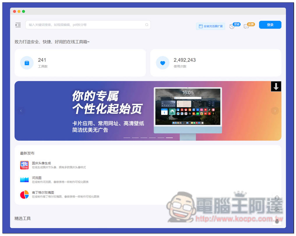 進到 67tool 網站之後,最上方會告訴你目前已經有多少工具可用(241 個),右邊則是被使用次數,將近快 250 萬次。有新工具上架時,最新發佈也會通知:
