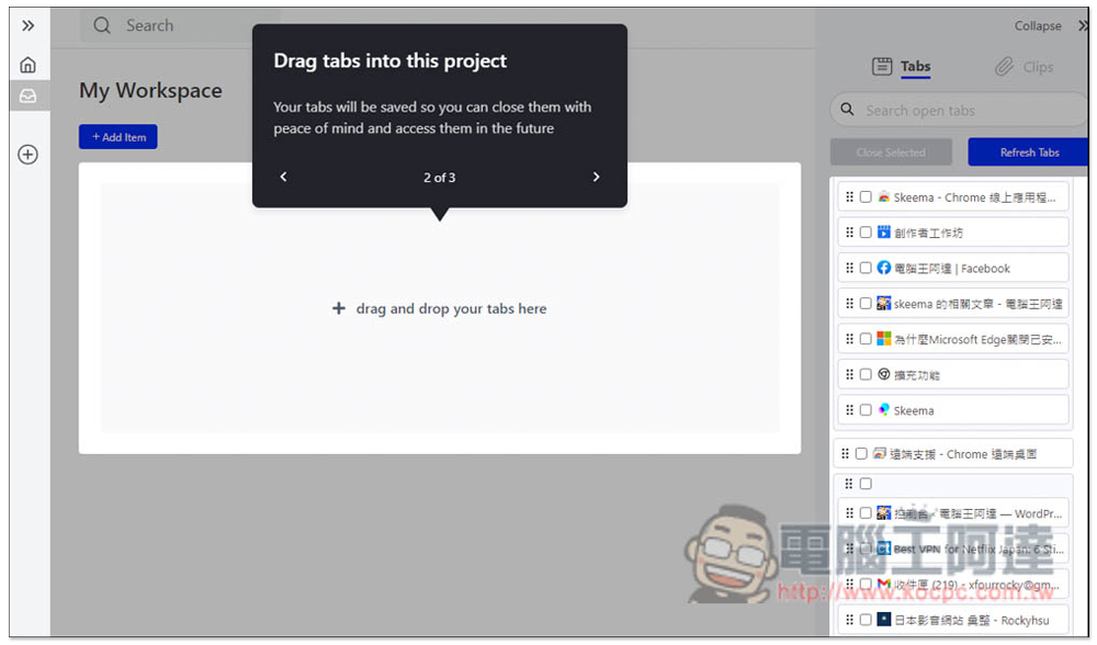 接著就會進入管理介面,使用方式很簡單,最右邊會顯示你目前瀏覽器已經開啟的分頁,用多個瀏覽器視窗也會分開顯示,所以很好找。而中間 My Workspace 就是管理面板,: