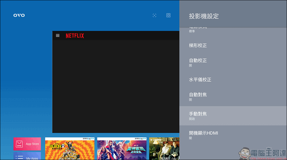 投影設定方面, OVO K3E 不僅支援正面投影與側面投影,更提供進階的設定選項,像是自動對焦、水平儀校正、手動對焦等設定。