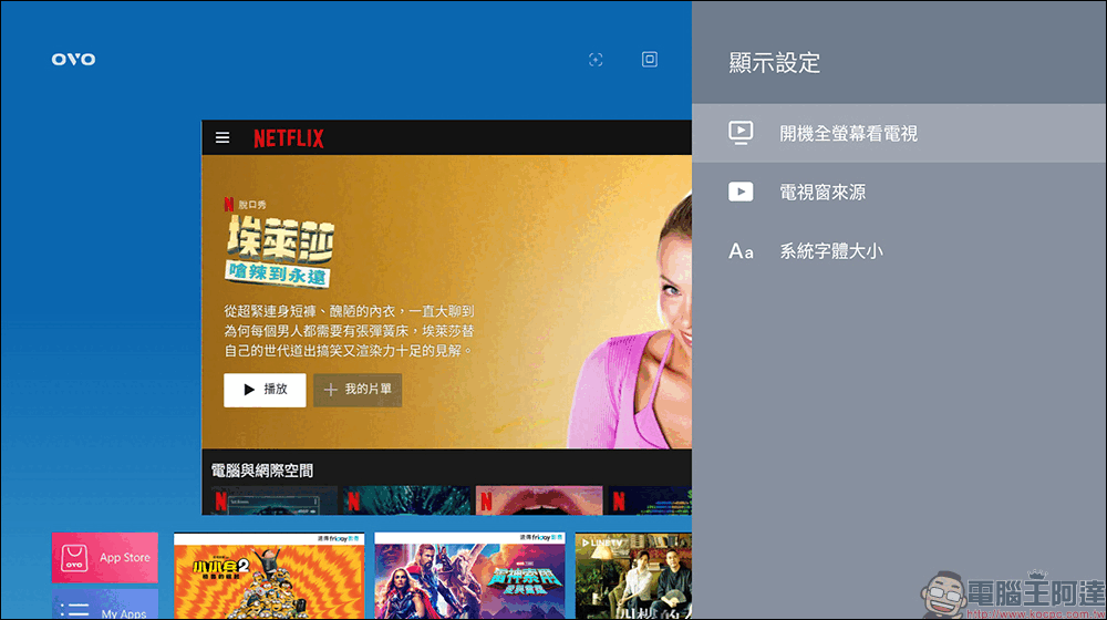 OVO K3E 智慧投影機還支援一項超方便的開機全螢幕看電視功能,用戶只需先定常用的影音平台,接著在下次開機就會自動開啟該 App 進行全螢幕播放。