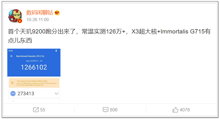 幾天前中國數碼閒聊站爆料首個天璣 9200 旗艦處理器的安兔兔跑分,拿到了 1,266,102 分,也就是 126.6 萬,並透露這個測試是在常溫環境,具有 X3 超大核與 Immortalis G715 圖形處理器: