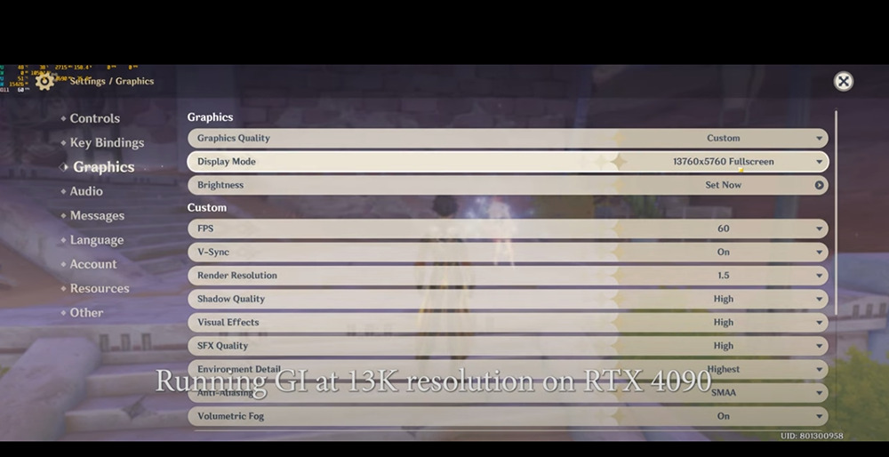 近日國外 YouTube 頻道 Golden Reviewer 上傳一部使用 RTX 4090 顯卡,以 13K 解析度的設置來運行原神遊戲,某些讀者可能不太清楚 13K 解析度的數字是多少,下方是影片截圖,可以看到原神裡面的解析度設置達到 13760×5760,這也是我第一次看到這麼誇張的數字: