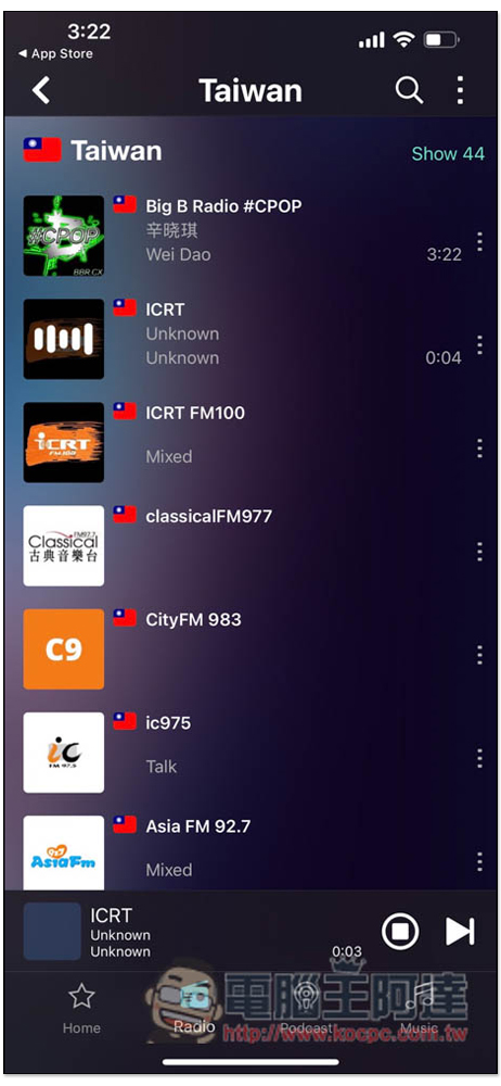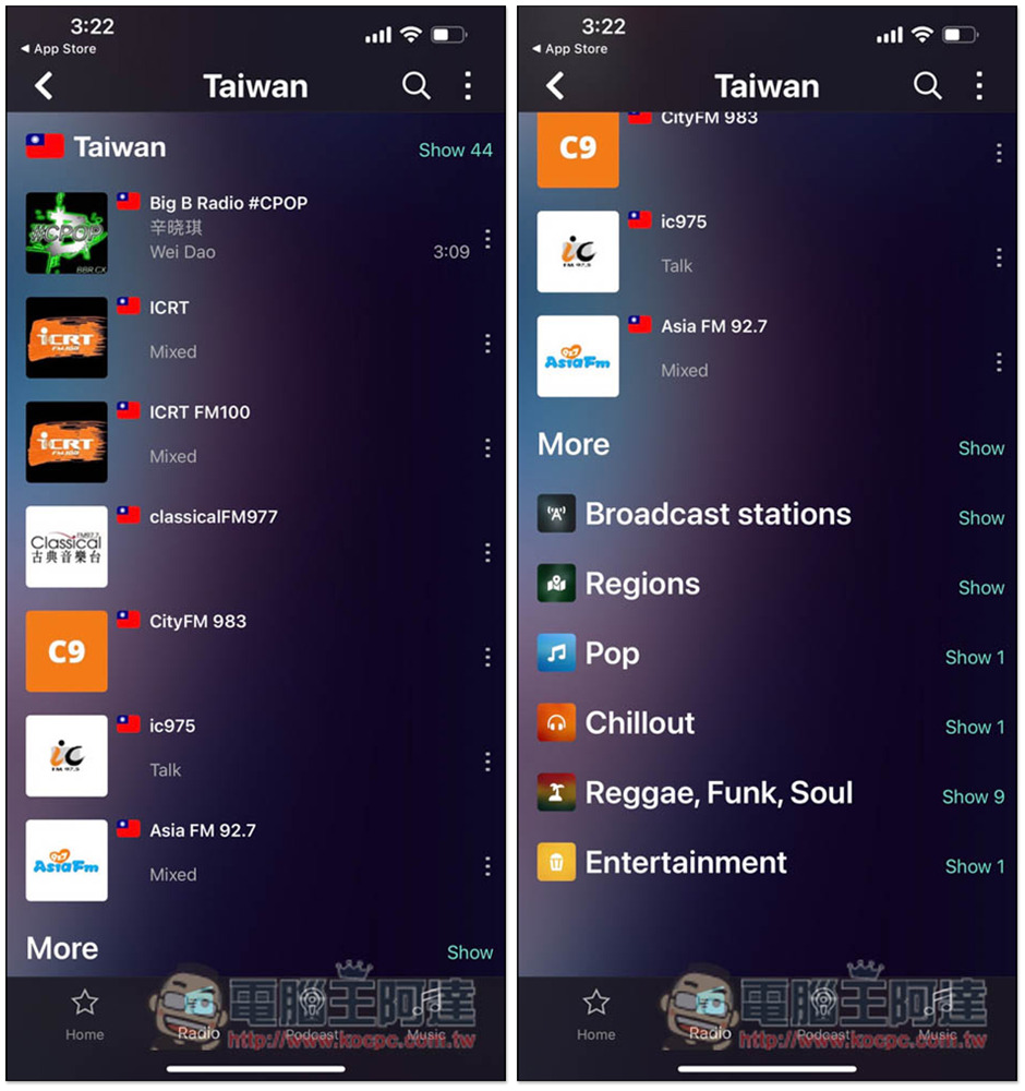 Regions 分類蠻特別的,以台灣來說,目前有整理台中市和桃園市的電台,不過應該不止這些,可能是這 App 國外開發的,因此中文市場部分分類沒那麼齊全和準確,美國、英國等國家應該會分的更正確: