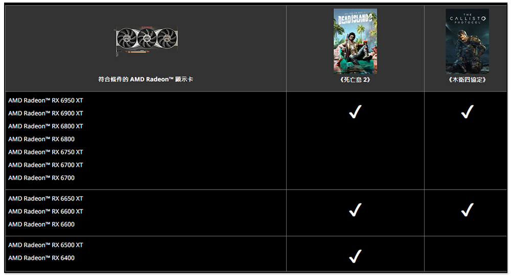 不過不是買每一張 AMD Radeon™ RX 6000 都會送二款遊戲,從下方可以看 Radeon™ RX 6400 和 Radeon™ RX 6500 XT 只有送《死亡島 2》,Radeon™ RX 6600、Radeon™ RX 6600 XT、Radeon™ RX 6650 XT、Radeon™ RX 6700、Radeon™ RX 6700 XT、Radeon™ RX 6750 XT、Radeon™ RX 6800、Radeon™ RX 6800 XT、Radeon™ RX 6900 XT 以及 Radeon™ RX 6950 XT 才是都送: