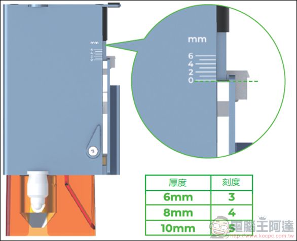 另外由於xTool D1 Pro 20W是可以直接切斷10mm的木板以及8mm的壓克力板,所以如果有需要切割較厚的材料,則需要調整雷射模組內雷射頭的高度,厚度及定焦桿的刻度設定可以參考下面這張官方說明圖: