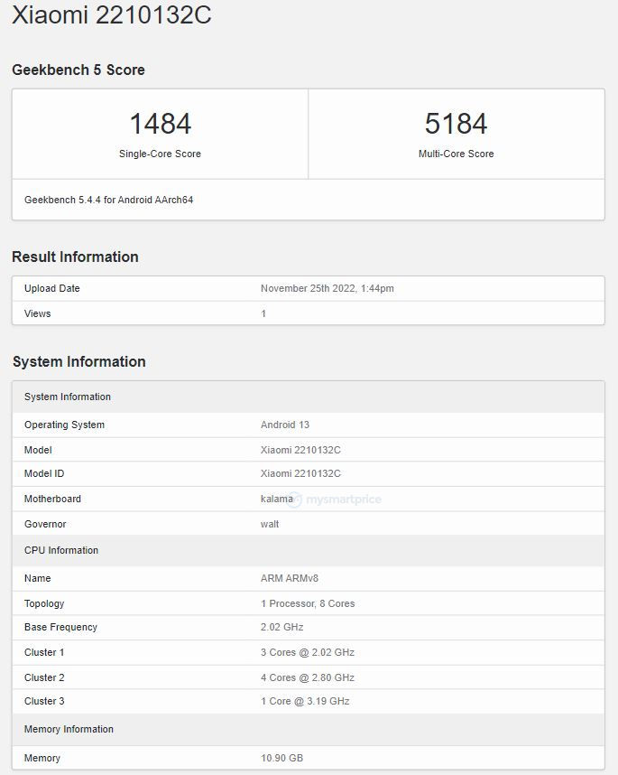 近日外媒 MySmartPrice 發現到 Geekbench 5 的資料庫中,出現小米 13 和小米 13 Pro 的蹤跡。首先是小米 13,這款型號為小米 2211133C,記憶體是 12GB RAM,內建 Android 13 作業系統。單核心獲得 1497 分,多核心則是 5089 分: