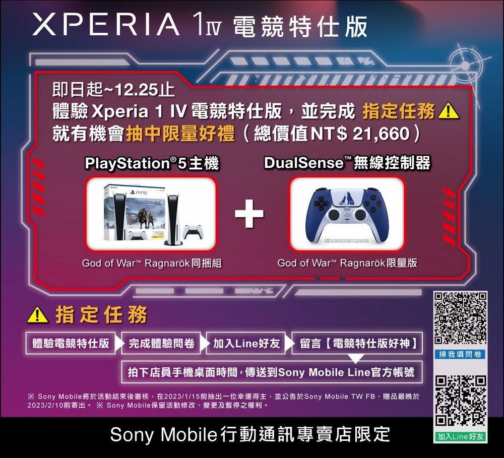 Sony Mobile 為迎接 Xperia Stream 電競套件開賣,即日起至12月25日 (日) 止,凡至Sony Mobile行動通訊專賣店體驗Xperia 1 IV Gaming Edition電競特仕版,完成體驗活動與問卷、加入官方Line好友並完成指定任務,就有機會抽中總價值NT$21,660的限量超值好禮,將PlayStation®5 主機God of War™ Ragnarök 同捆組,以及DualSense無線控制器God of War™ Ragnarök限量版通通帶回家!