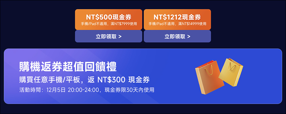 於 12 月 5 日 20:00 至 12 月 12 日 23:59 期間,購買手機、平板可使用「NT$300手機券」和「NT$500 手機券」,另外購買指定手機還享贈品。搭配直降活動可折上加折,最高省 NT$6,500 !