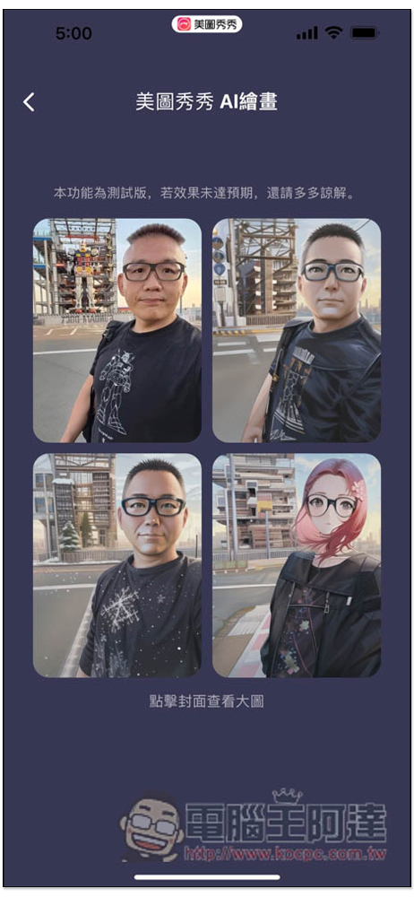 接著就會獲得全部圖片啦,右下似乎都是非常女性的風格,連阿達都變成女生了(笑),而且還是紅頭髮。另外我也測試過,用同一張照片重新 AI 繪圖一次,獲得的三張圖片都一樣,因此如果你不滿意,只能換其他新照片試試: