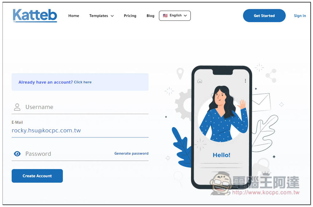 Katteb 是一款 AI 寫文付費服務,不過首次註冊可以獲得免費試用,有 2,000 字的扣打,雖然整篇文章可能不太夠用(最近在 APPSUMO 有賣終身免費的會員,才 29 美金,如果試用覺得不錯的話可以考慮),但至少可以建立一些文章重點摘要、主題等等,於 Email Address 輸入你的信箱,會需要收認證信: