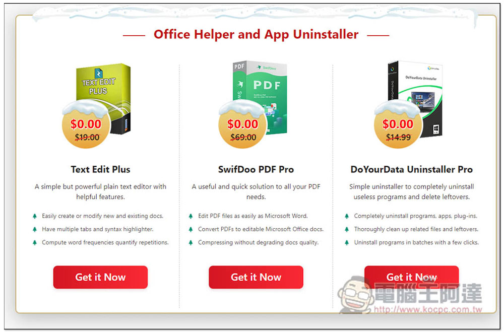 進到 AOMEI 聖誕活動頁面後往下滑,就能找到 21 款限免軟體的下載按鈕(Get it Now),而且還有分類,像是第一個是資料備份和復原軟體,有我們一直推薦的 AOMEI Backupper Pro,以及 iOS 作業系統用的 AOMEI FoneTool Pro,另外還有一套 AOMEI My Recover Pro,光這邊就能省下 120 美金左右。每一套下方都有特色說明,按 Get it Now 就會下載安裝檔: