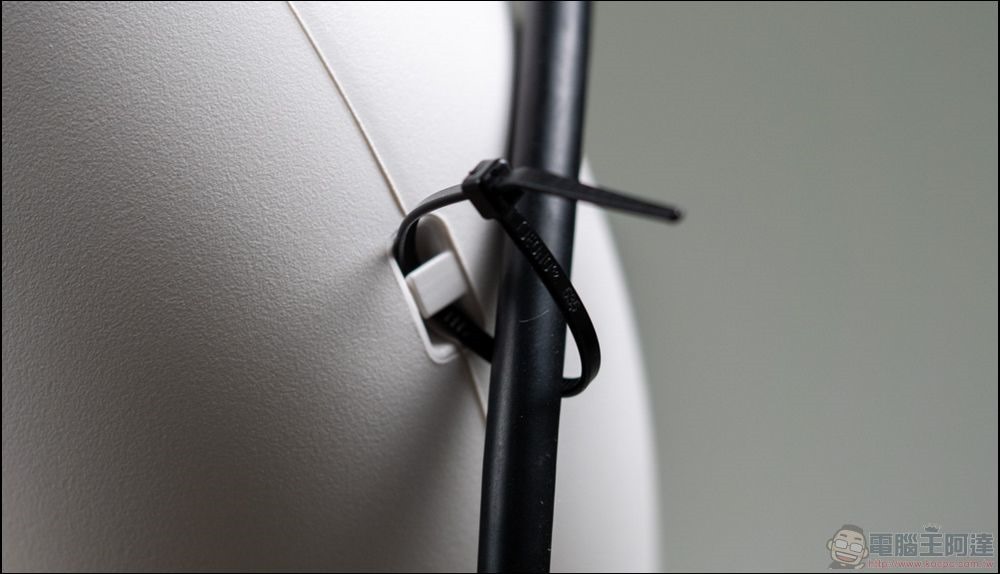 接好螢幕以後,可以將螢幕電源以及訊號線用束帶固定在支架預留的小洞上,記得不要拉太緊,畢竟支架會往前延伸,所以要預留延伸的空間: