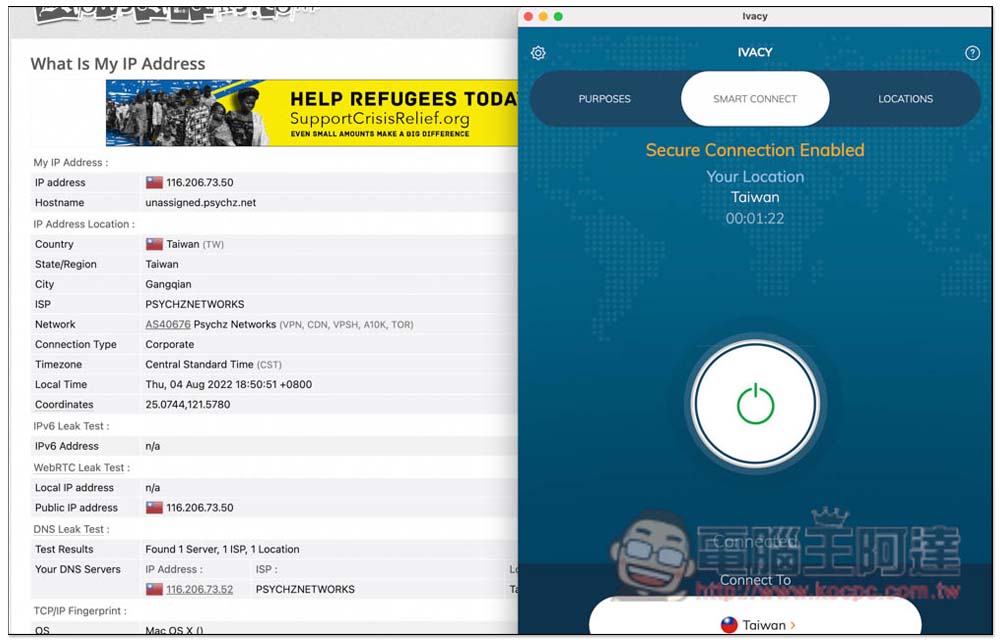 我也實測過,Ivacy 的 IP、DNS、WebRTC 都沒有洩漏問題: