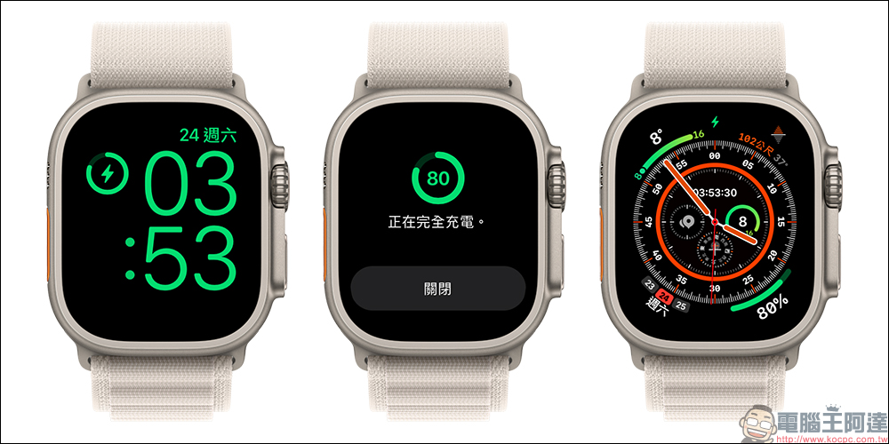 一旦將「最佳化充電上限」功能關閉後, Apple Watch Ultra 的充電圖示就會恢復到一般充電狀態,直到充電至 100% 。此時 Apple Watch Ultra 充電圖示的外圈也少了限制標示。