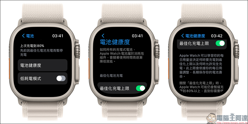 除了一般 Apple Watch 支援的「最佳化電池充電」功能之外, Apple Watch Ultra 還提供「最佳化充電上限」功能。根據 Apple 官方的說明,「最佳化充電上限」功能會從用戶的日常使用情庫中學習,以判斷何時該充電至最佳化上限、何時該充飽電。由於此功能預設為開啟的,因此如果使用 Apple Watch Ultra 的時間不太固定,建議可以將此功能手動關閉,以確保手錶取下能隨時保持在充飽電的狀態。
