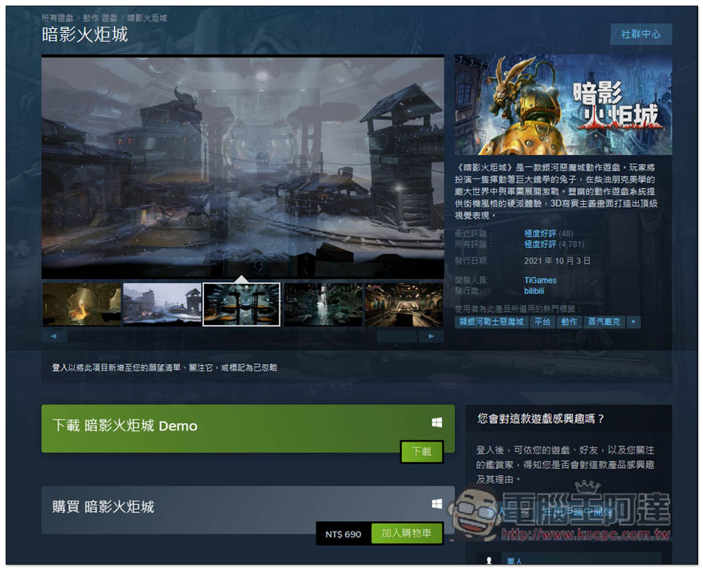 進到《F.I.S.T.: Forged In Shadow Torch》的 EPIC Games Store 頁面後,就會看到原價 NT$690 被劃掉,現在免費取得,一直到 2022/12/28 01:00 結束。點擊右邊的獲取: