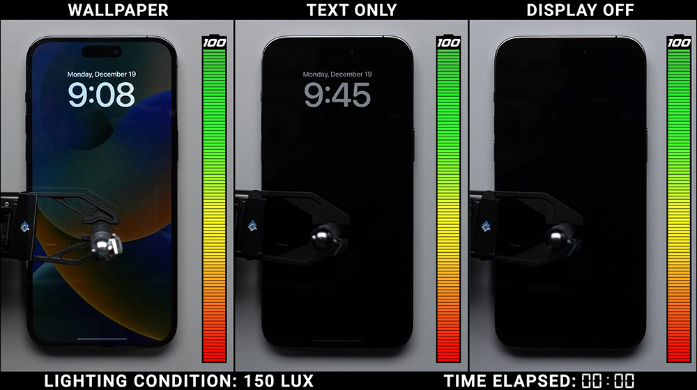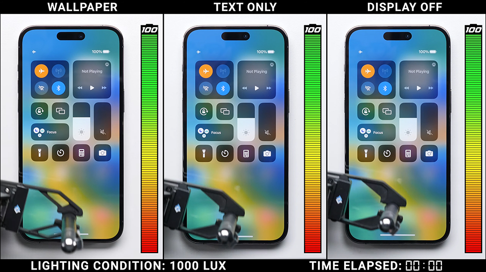 接著 PhoneBuff 持續在 1000 LUX 亮度環境下測試更極端的使用情境,目的是測試 24 小時待機後 iPhone 14 Pro Max 的永遠顯示功能對電耗的影響。結果在 24 小時後,開啟永遠顯示並將「顯示背景圖片」功能開啟,剩餘電量為 80%。而關閉顯示背景圖片的永遠顯示功能,剩餘電量 84% 。更驚人的是 iPhone 14 Pro Max 如關閉永遠顯示功能,待機 24 小時電量還保持在 100% 。