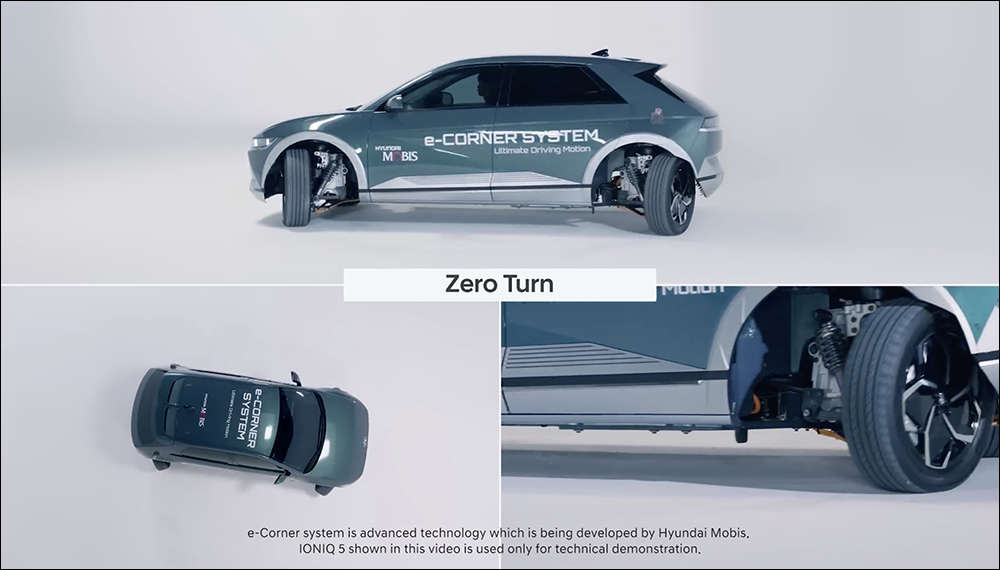 Hyundai Mobis 釋出的 e-Corner System 短片,分別展示了可以實現螃蟹行走(Crab Driving)、Zero Turn(原地旋轉)、斜向行駛(Diagonal Driving)以及後輪定點轉向(Pivot Turn)等動作,這也是一般車輛很難實現的行駛方式。