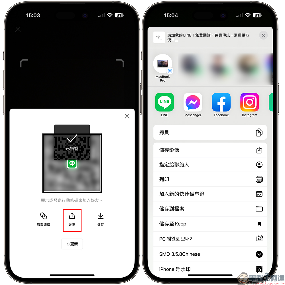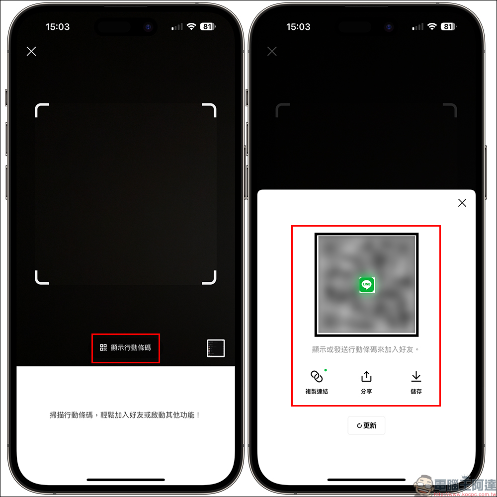 另外一種方式則是透過「行動條碼」加好友,這方式預設會開啟相機,透過掃描他人的 LINE 行動條碼完成加好友步驟。若想讓對方掃自己的好友行動條碼,則可點擊「顯示行動條碼」開啟 QR Code 。在「顯示行動條碼」畫面下方,還能選擇「複製連結」、「分享」或是「儲存」行動條碼三種延伸的加好友方式。