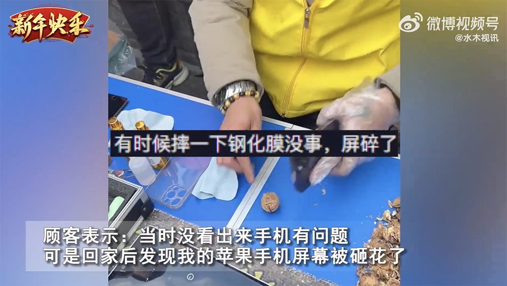 根據中國媒體報導,幾天前一位位於湖北的女性,在路邊找一個提供鋼化膜的攤販,幫自己的 iPhone 14 Pro Max 貼上,一般來說,如果保護貼店家想證明,都會使用自己準備的手機,畢竟把客人的砸壞,這糾紛可大了,還要賠償不少錢,就算真的有信心,但這中國攤販不同,它的最大特色在貼完顧客手機後,都會直接拿起來於下方放一顆準備好的核桃,螢幕向下用力砸下去,來證明自家鋼化膜保護貼的堅固性,不會破,這操作也吸引不少人圍觀: