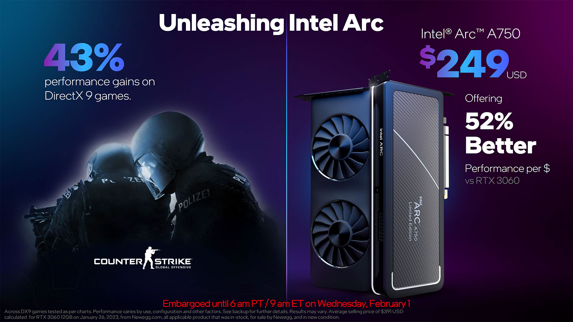 隨著 NVIDIA、AMD 發表越來越多新一代顯卡,Intel 去年推出的 Arc 相對吸引力就沒那麼大,或許是因為這原因導致銷售不佳,Intel 最近決定改變策略,近日宣布調低 Arc A750 顯示卡的售價,變成跟 RTX 3060 差不多,同時新推出的驅動程式,也將大幅提升 A750 的遊戲效能表現,這樣來看 A750 的 CP 值可說相當不錯。