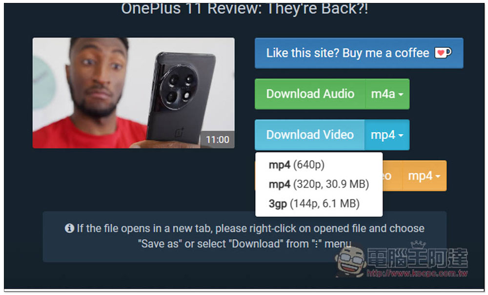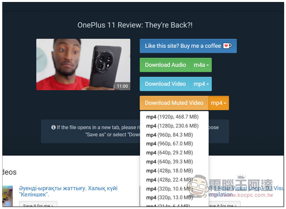 YouTube 會顯示三種載點,分別為 Audio 音訊、Video 影片、以及 Muted Video 只有影像的影片,最上方 Like this site? Buy me a coffe 是贊助按鈕: