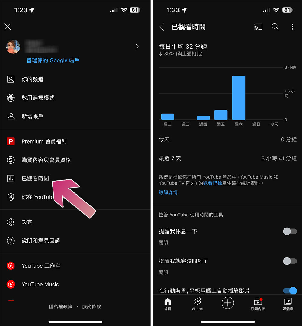 你可以購過打開 YoTube 應用程式,點擊個人頭像後,從「已觀看時間」中查看你平均的 YouTube 使用方式,或是根據自己常規的觀看習慣評估自己看了多久。例如,假設你每天觀看 YouTube 內容 2 小時,在每月總計觀看的 60 小時中,可以合理地估計你至少會看到 90 分鐘的廣告。