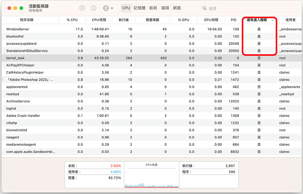 接下來,在活動監視器視窗裡向右捲動,點擊「避免進入睡眠」標題進行排序,你可以看到凡是該睡不給睡的進程都會顯示個「是」。你也可以將避免進入睡眠的欄位向前拖移方便檢閱。