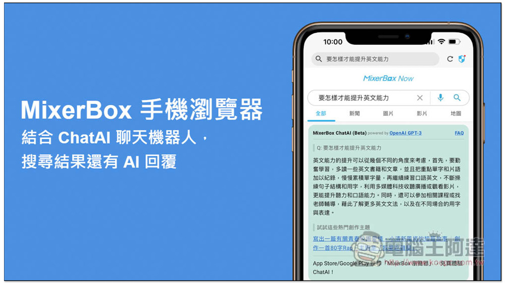 隨著 Microsoft 推出 Bing 版 ChatGPT,一些瀏覽器廠商也看到這個商機,想要趁這時候快速提升用戶數量。MixerBox 手機瀏覽器 App 最近就宣布推出搭載 OpenAI GPT-3 的全新版本,搜尋任何關鍵字時,除了原本的網頁結果,也會有 ChatAI 聊天機器人回覆,提供你更多實用的解答。iOS、Android 版都有,完全免費,而且標榜超高隱私性,100% 無痕,不會儲存任何搜尋記錄。