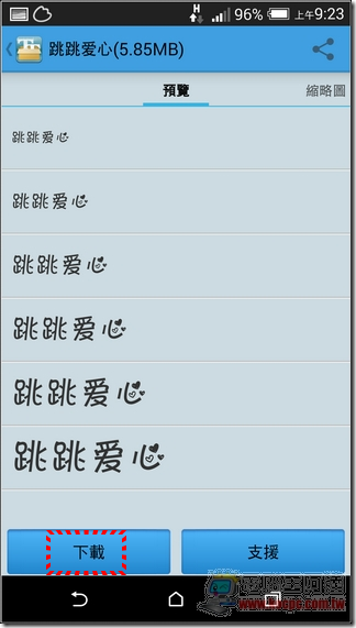 以其中的「跳跳愛心」為例,選擇後有字體各尺寸預覽,如果覺得沒問題的話點擊「下載」,愛字型就會把您要的字型下載到裝置中: