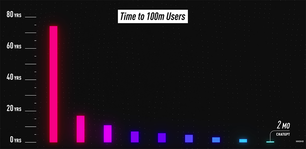不過最近從 MKBHD 針對 AI 技術的最新影片「The Biggest Problem with AI!」中,就有提到 ChatGPT 的使用者達到百萬使用者者的速度僅花了 2 個月,遠遠超越以往如手機與 Netflix 等花了十多年;Facebook(48 個月)- 即便是目前十分火熱的 TikTok 都花了 9 個月的時間!