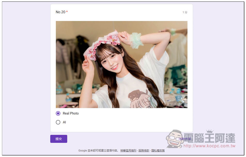 進到「AI真人辨識測驗 1st」Googel 表單後,往下滑開始作答,共有 20 張美女圖。另外從名字有 1st 來看,猜測這作者有可能會再做第二輪測驗: