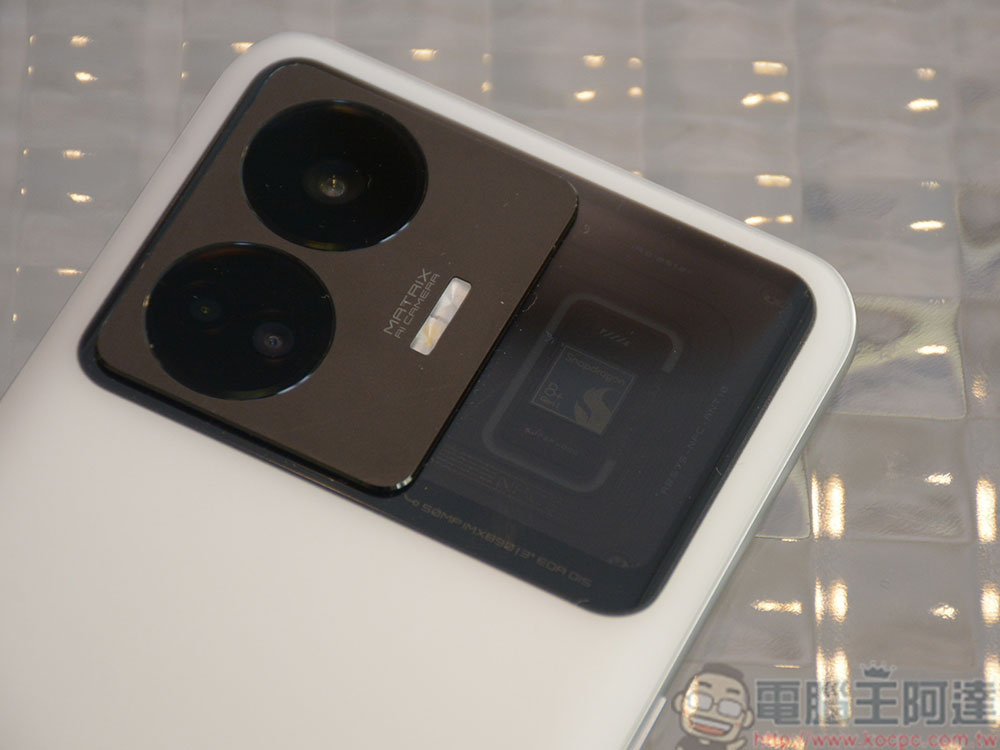 在相機模組旁邊的半透明窗口中,隱隱約約可以看到 Qualcomm Sanpdragon 8+ Gen 1 處理器晶片的裝飾性圖樣與 NFC 天線。