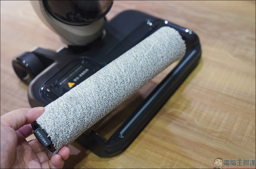 從清潔滾刷底部,可觀察到它除了擁有一對活動輪組和一對輔助輪,讓清潔過程前後移動、調整方向更不費力。此外,在清潔滾刷的另一側設有後端出風口,能將拖地後的地面快速風乾,減少水漬殘留在地板並避免二次污染。
