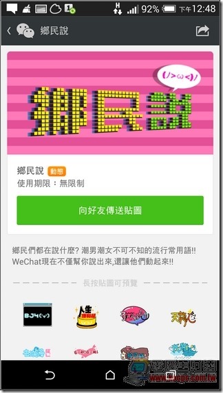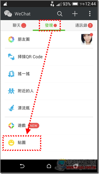 只要開啟 WeChat,執行「發現」—>「貼圖」,裡面就會看到最新的最上面的就是最新的四組貼圖:
