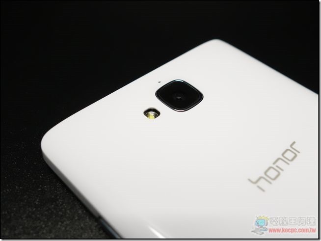 榮耀3C背面特寫,採亮面塑膠材質設計,並在背面的左右兩側以弧狀收邊,對於握感的提升有很大的幫助,搭配鏡頭下方的「honor」標示還蠻好看的,顏色方面則只有白色,不知道官方將來會不會出多彩背蓋來替換: