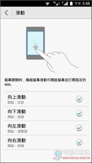 此外榮耀3C 也搭載了一些貼心的體感操作,如將螢幕翻轉向下開啟靜音、以及在待機的情況下輕點兩次螢幕開啟電源,或是上下左右滑動啟動指定App(類似 HTC 或 LG 的觸屏啟動),真的很好用: