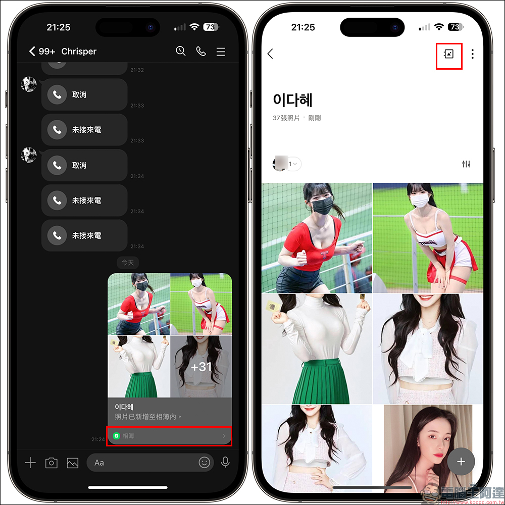 在 LINE「所有相簿」會顯示不同 LINE 聊天室中的所有相簿內容,也會在各個相簿顯示相簿名稱、照片數量以及上傳者。用戶也可點選「照片」或「相簿」切換不同的顯示方式。