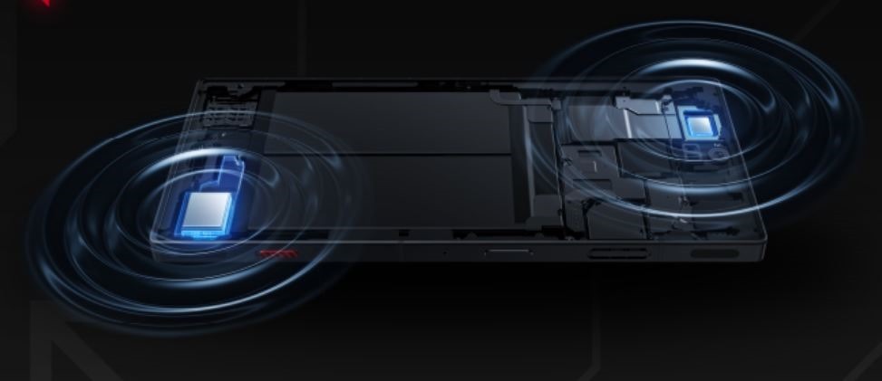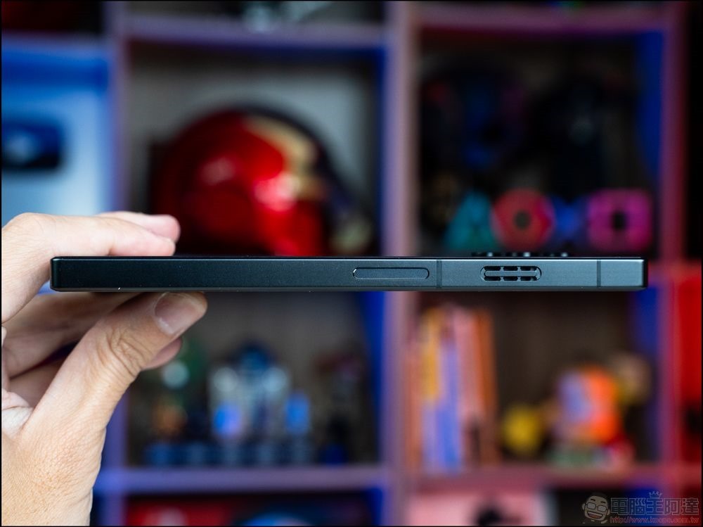 機身右側的上下兩端配置了採樣速度高達 520Hz的感應式實體肩鍵、進風口、電源鍵、讓使用者玩電動時橫轉機身也能收音與隊友溝通的側面麥克風與紅魔電競模式開關: