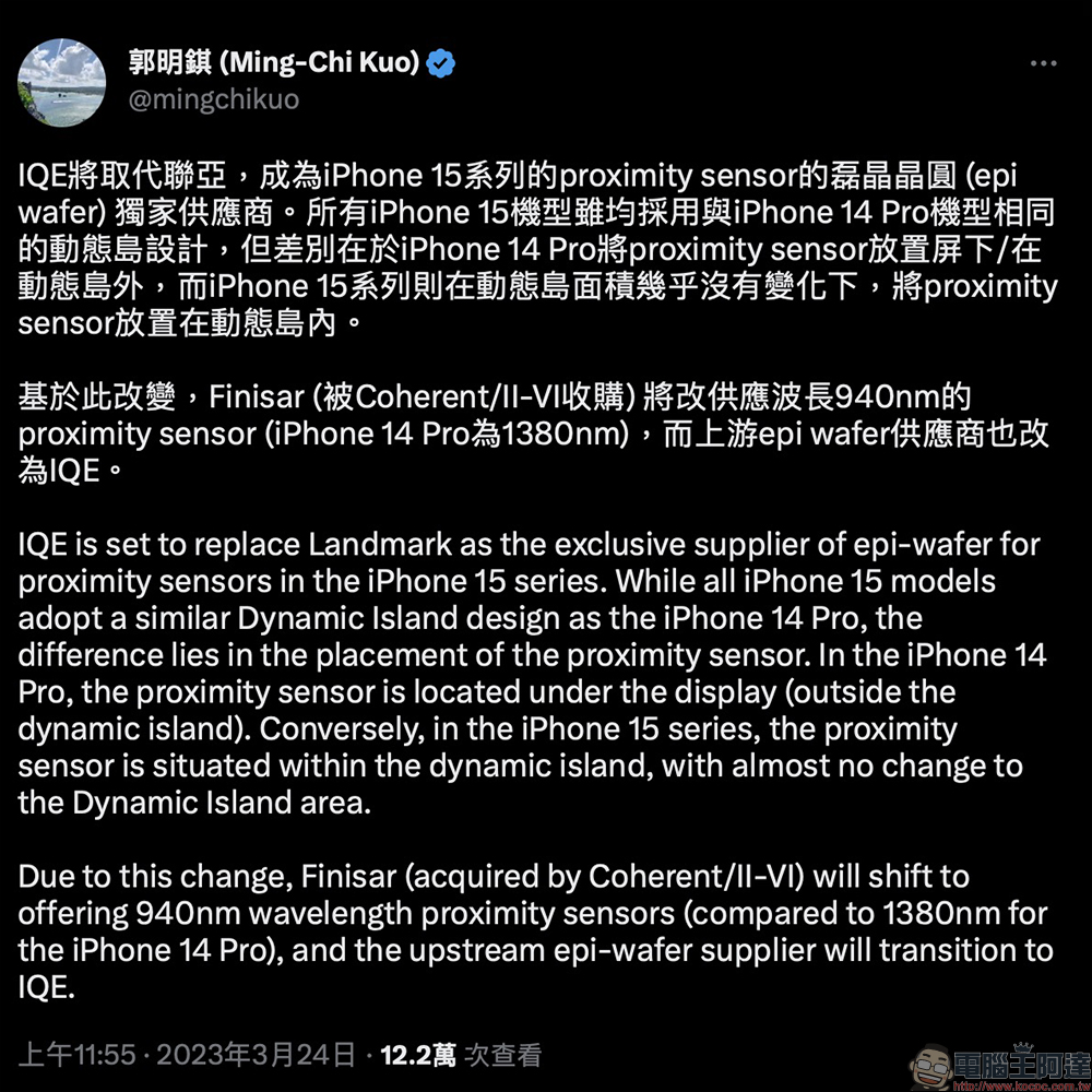 郭明錤(Ming-Chi Kuo)表示,Apple 供應商 Finisar 將轉向為蘋果提供 940nm 波長的距離感測器,而 iPhone 14 Pro 距離感應器的波長則為 1380nm。