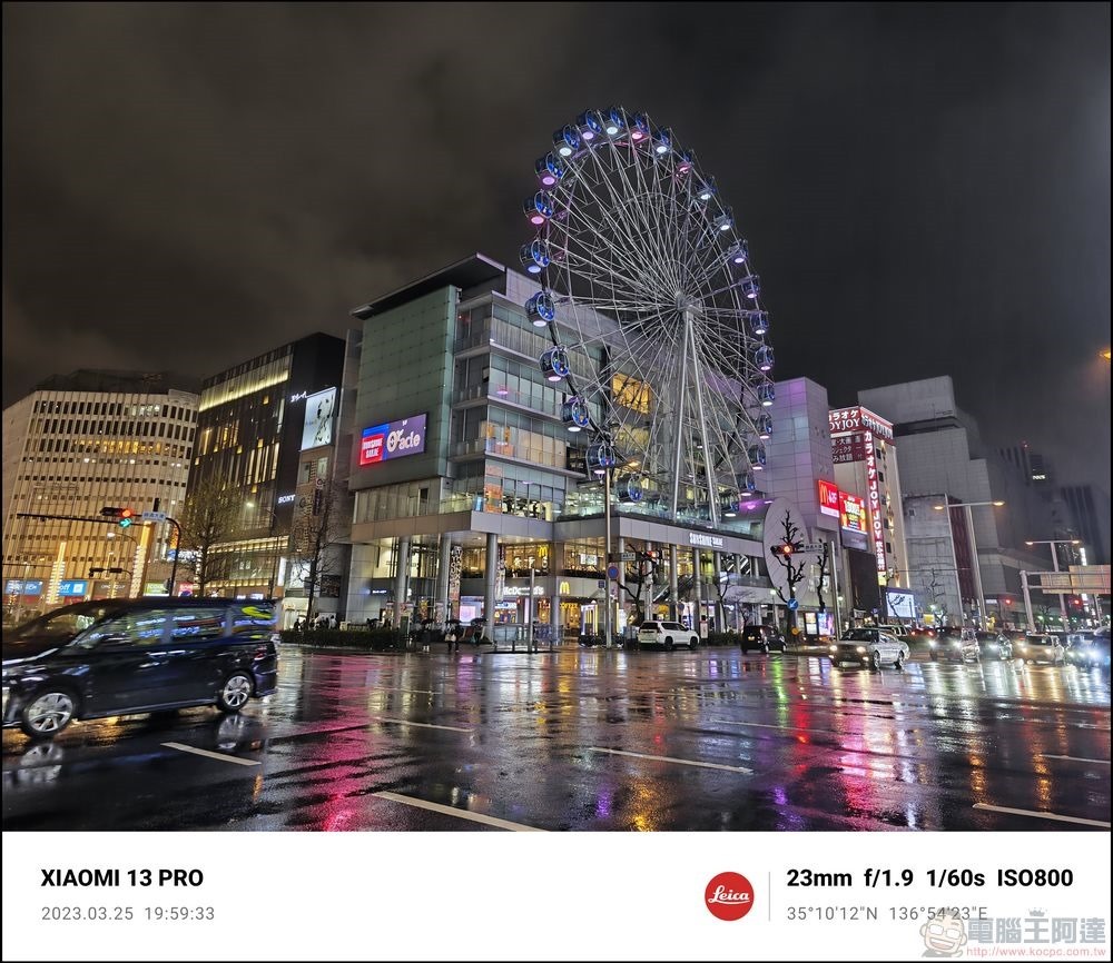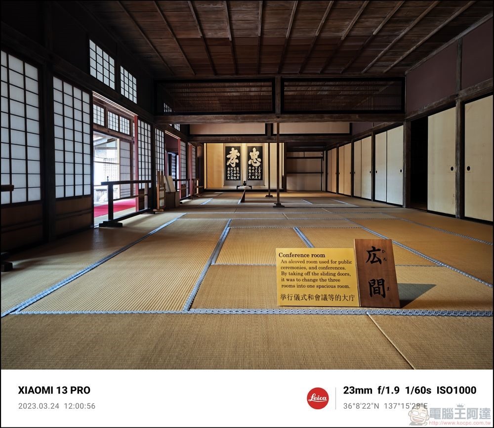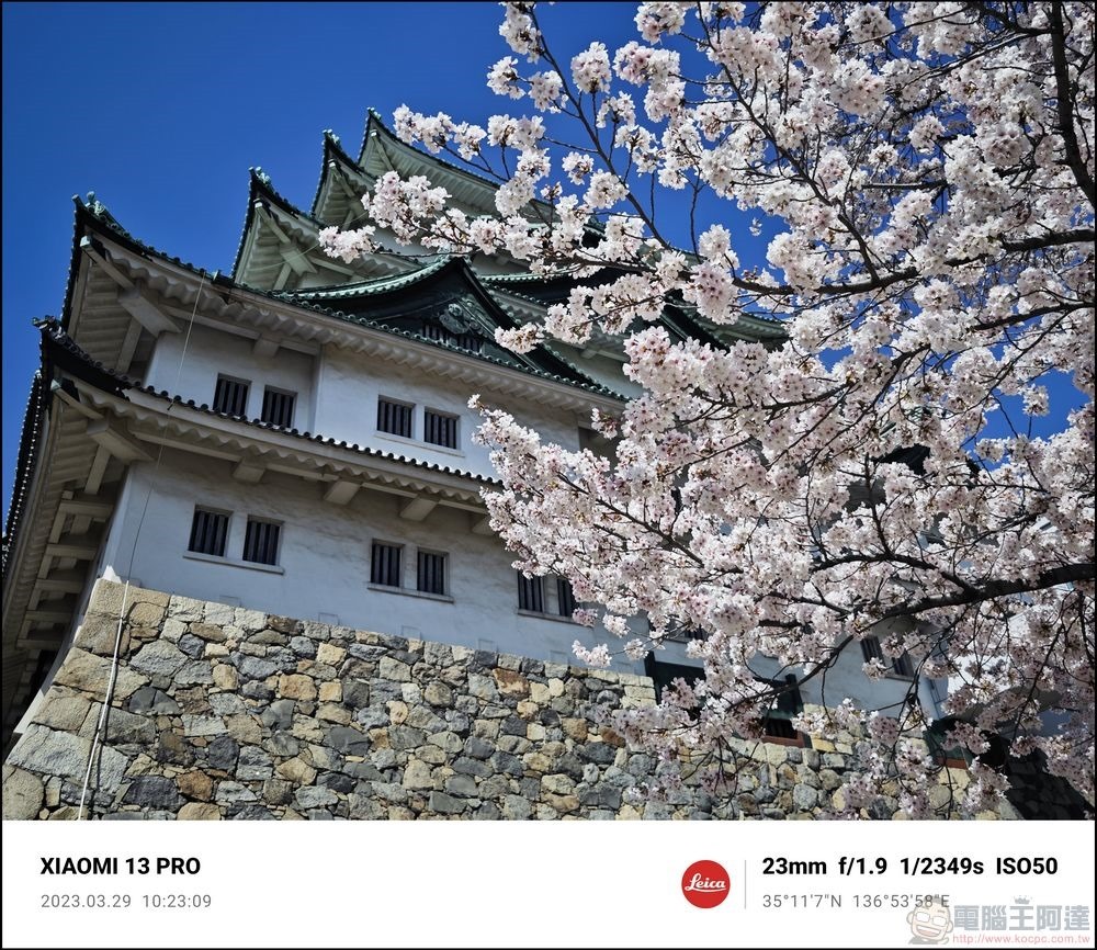 這次阿達也帶了 Xiaomi 13 Pro 去名古屋與京都拍攝櫻花,前面四天都是陰雨,幸好第五天之後放晴,大部分的景點櫻花都接近滿開,拍的很盡興。不過因為照片太多,櫻花的部分我會放另外一篇,大家先看 Xiaomi 13 Pro 的一般攝錄影表現。首先來看一下這三顆鏡頭分別的成像效果,首先是 14mm 超廣角(均使用徠卡生動模式拍攝),如果使用徠卡專用的浮水印的話會顯示可樂標、日期/時間、焦段、快門速度與ISO和座標(可關閉):