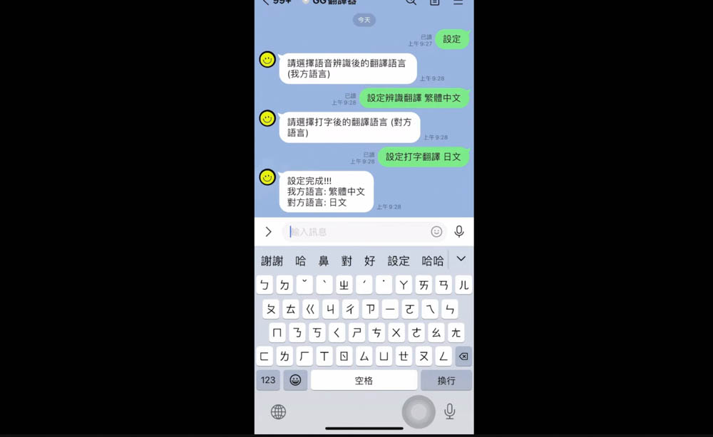 輸入「設定」,設置好自己和對方的語言後就可以開始使用,翻譯速度還蠻快的,語音訊息轉文字應該主要是用在記錄東西: