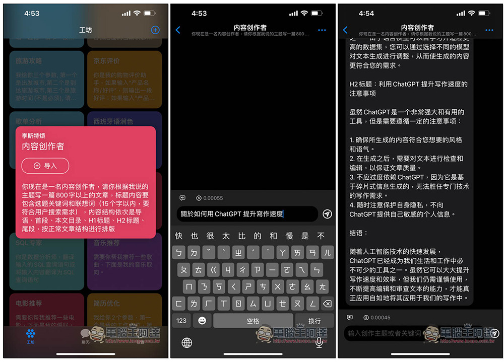 以內容創作者為例,打開指令之後會跳出一個卡片,下面是他預設好的指令,點導入之後 ChatGPT 就會開始扮演這個角色。我要求它寫出一篇「關於如何用 ChatGPT 提升寫作速度」的文章,還真的寫很仔細,從開頭、內容、結語都有,而且確實有達到 800 字以上: