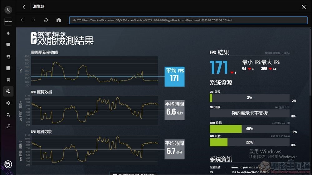 接著我們來看看《虹彩六號:圍攻行動》在1080p解析度下的表現,開啟高畫質可以有171 FPS的表現。(畫面品質由低到高為:低、中、高、非常高、超高)
