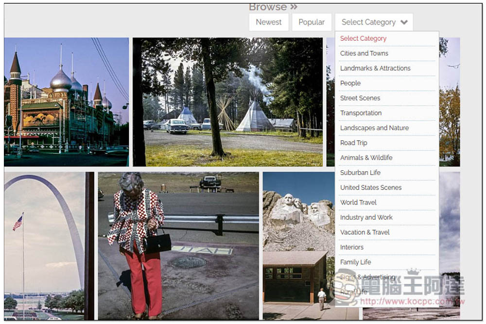 分類選項位於右邊,目前共有 18 個,像是城市和城鎮(Cities and Towns)、人們(People)、街景(Street Scenes)、交通工具(Transportation)、渡假和旅遊(Vacation & Travel)、家庭生活(Family Life)等等,分類非常多,甚至還提供有一個專屬的美國風景(United States Scenes):