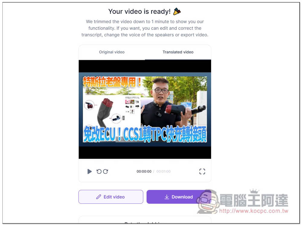 接著可以先線上試聽效果,我測試的這部影片有四分多鐘,免費版只能翻譯 1 分鐘,因此它就只有幫我翻前面 1 分鐘的片段,喜歡的話按 Download 就能把影片下載下來: